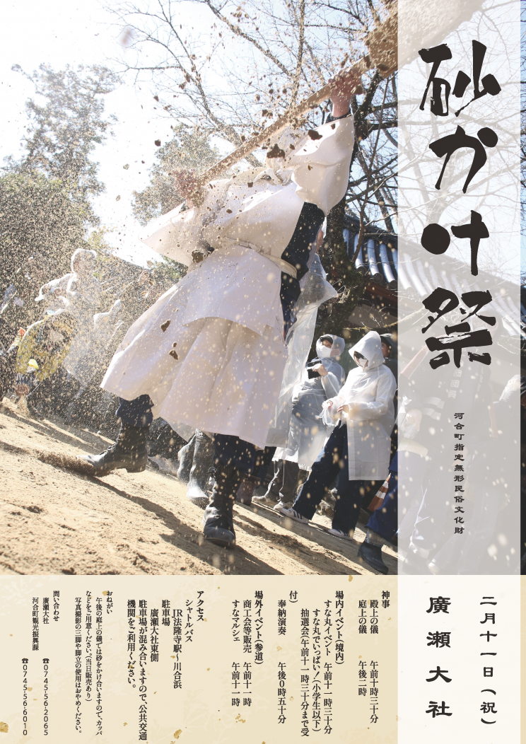 この祭典の正式名称は「お田植祭」ですが、砂を雨に見立てて掛け合うことから大和の奇祭「砂かけ祭」と呼ばれるようになりました。古くは平安時代の延喜式祝詞にも残る「廣瀬大忌祭」の中で行われていた一行事が現在に継承されています。